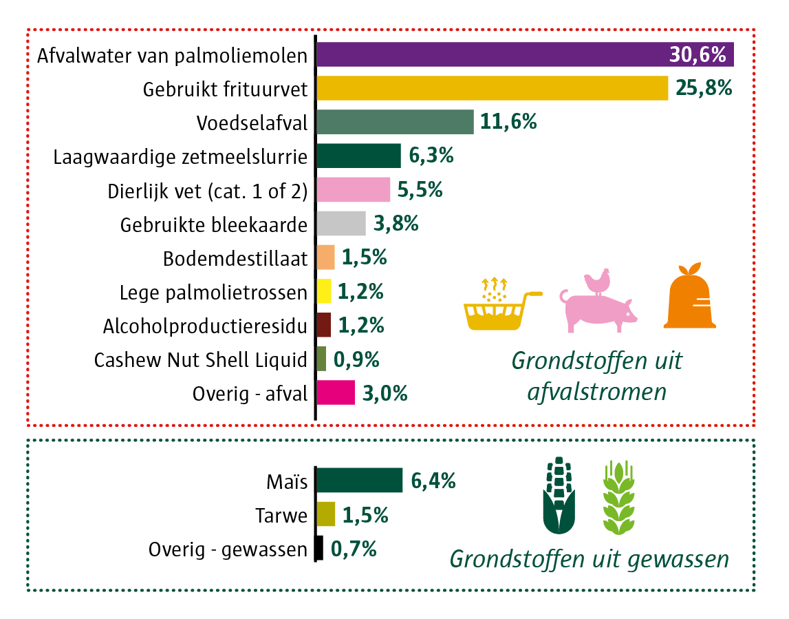 Ongeveer 91% van de biodiesel die we in Nederland gebruiken is gemaakt van afvalstromen. In 2025 beslaat afvalwater van palmoliemolens 31% van de grondstoffen, 26% komt van gebruikt frituurvet en 6% komt van dierlijk vet dat niet geschikt is voor menselijke consumptie. Nederland is daarmee in Europa koploper bij het gebruik van afval en restmateriaal. Voor de biodiesel die we in Nederland gebruiken worden weinig tot geen voedingsgewassen gebruikt. In Europa als geheel is raapzaadolie de belangrijkste grondstof voor biodiesel.